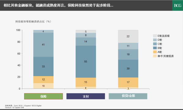 第二,如果看保险、支付、信贷,D轮和E轮,保险科技尚没有出现,但在支付和信贷上看到很多E轮、D轮大规模公司,说明保险科技处于起步阶段,大的独角兽,大规模的融资仍然还没有出现。