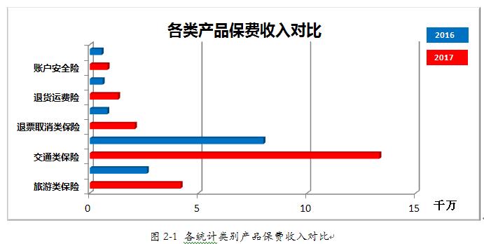 通过图2-2可以一目了然的了解到:2017年和2016年春节期间,以总保费测算,热销前三位的产品种类均为航空意外险、境外旅行险和航班延误险。