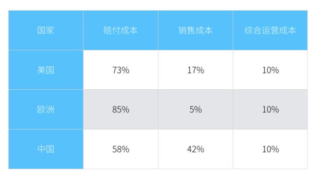 首先,我们分析一下车险的成本结构。目前成本由赔付成本、销售成本、运营成本三部分构成。横向来看,对比欧美成熟市场,我们在赔付成本和销售成本上都有着较大的差异和优化空间。