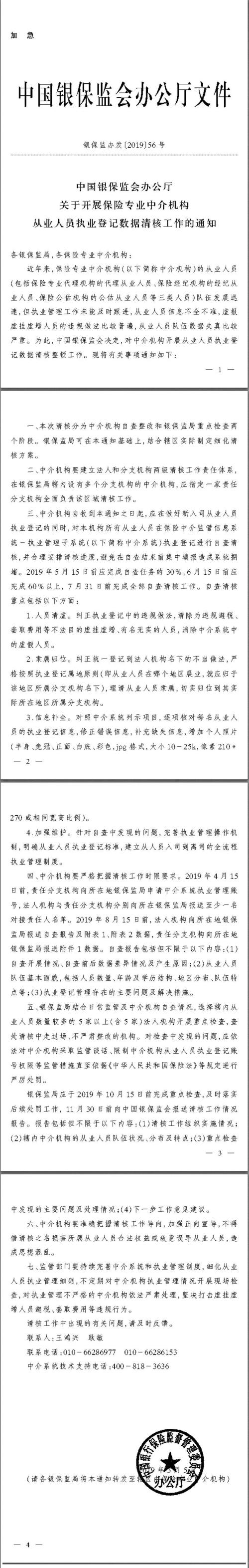 3月12日,中国银保监会面向各银保监局、各保险专业中介机构下发《关于开展保险专业中介机构从业人员执业登记数据清核工作的通知》(银保监办发[2019]56号)(以下简称《通知》),明确将针对保险专业中介机构(以下简称中介机构)的从业人员(包括保险专业代理机构的代理从业人员、保险经纪机构的经纪从业人员、保险公估机构的公估从业人员等三类人员)开展执业登记数据清核整顿工作。