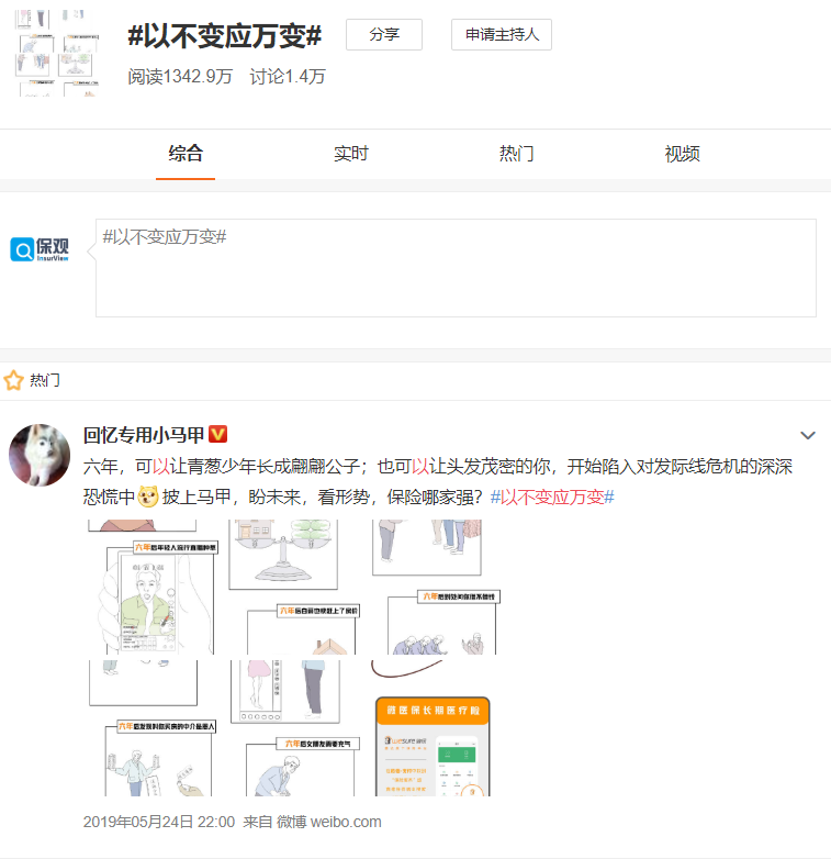 2019年5月,微保联合泰康人寿推出“微医保·长期医疗险”产品,不同于市场上的长期医疗险多采用的逐年续保方式,该款产品将保障期限提升至六年,且承诺保障6年不涨费。借助新产品上线的节点,微保也推出了一系列的营销活动,抓住新产品6年不涨费这一特点,微保官博围绕#以不变应万变#这一话题发布漫画类型的海报,通过对购物、房价等每个人都会经历的事情的6年前后对比,阐述了这6年间的变化:购物渠道由电视到直播、房价的上涨等,以6世界变化之快突出微医保长期医疗险是六年不涨价的产品,“以不变应万变稳稳地守护你不变”。