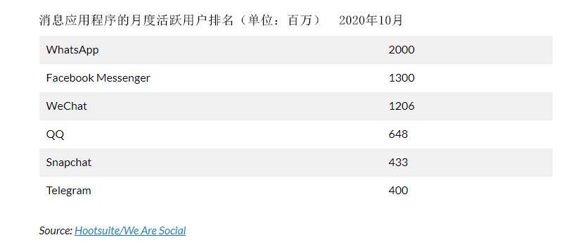 WhatsApp是Facebook公司旗下的软件,提供跨平台消息传递和IP语音服务,允许用户发送文本消息和语音消息,进行语音和视频通话,以及共享图像、文档、用户位置和其他媒体。该客户端应用程序于2014年2月被Facebook以193亿美元的价格收购。2015年,该程序成为世界上最受欢迎的消息传递应用程序。2020年10月,WhatsApp的月度活跃用户总数达到20亿,远超Facebook、微信、QQ等其他应用程序,已成为包括拉丁美洲、印度次大陆以及欧洲和非洲大部分地区在内的多个国家和地区电子通讯的主要手段。