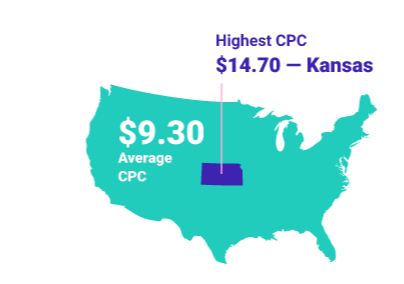 8. 各州之间的PPC保险竞争大致相同。在堪萨斯州,谷歌广告最昂贵,平均每次点击14.70美元。相比之下,美国的平均点击成本(CPC)约为9美元。