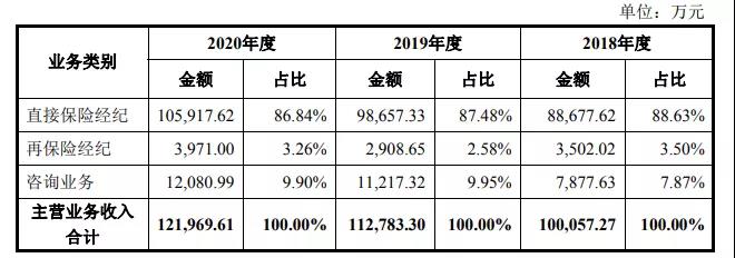 江泰保险是中国第一家开业的保险经纪公司,也是财险经纪中的头部企业。根据招股书,江泰保险的主要业务包括直接保险经纪业务、再保险经纪业务和咨询业务,2018年至2020年,江泰保险的主营业务收入分别为10.01亿元、11.28亿元、12.20亿元,其中直接保险经纪业务三年的占比均超过86%,是江泰保险收入的主要来源。
