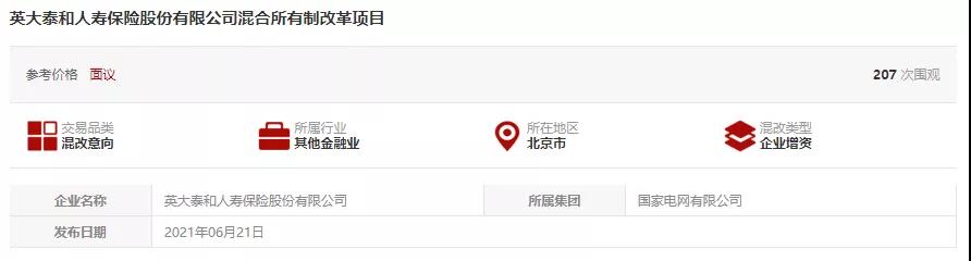 无独有偶,早在2019年11月,国家电网就在北京举行的引入社会资本专场推介会上,集中推介了包括英大财险、英大人寿在内的12个重点混改项目。其中,英大财险拟出让20%的股份,英大人寿拟出让30%的股份。7月,英大财险和英大人寿在北京产权交易所披露混改项目,拟通过增资扩股的方式,引入战略投资者。