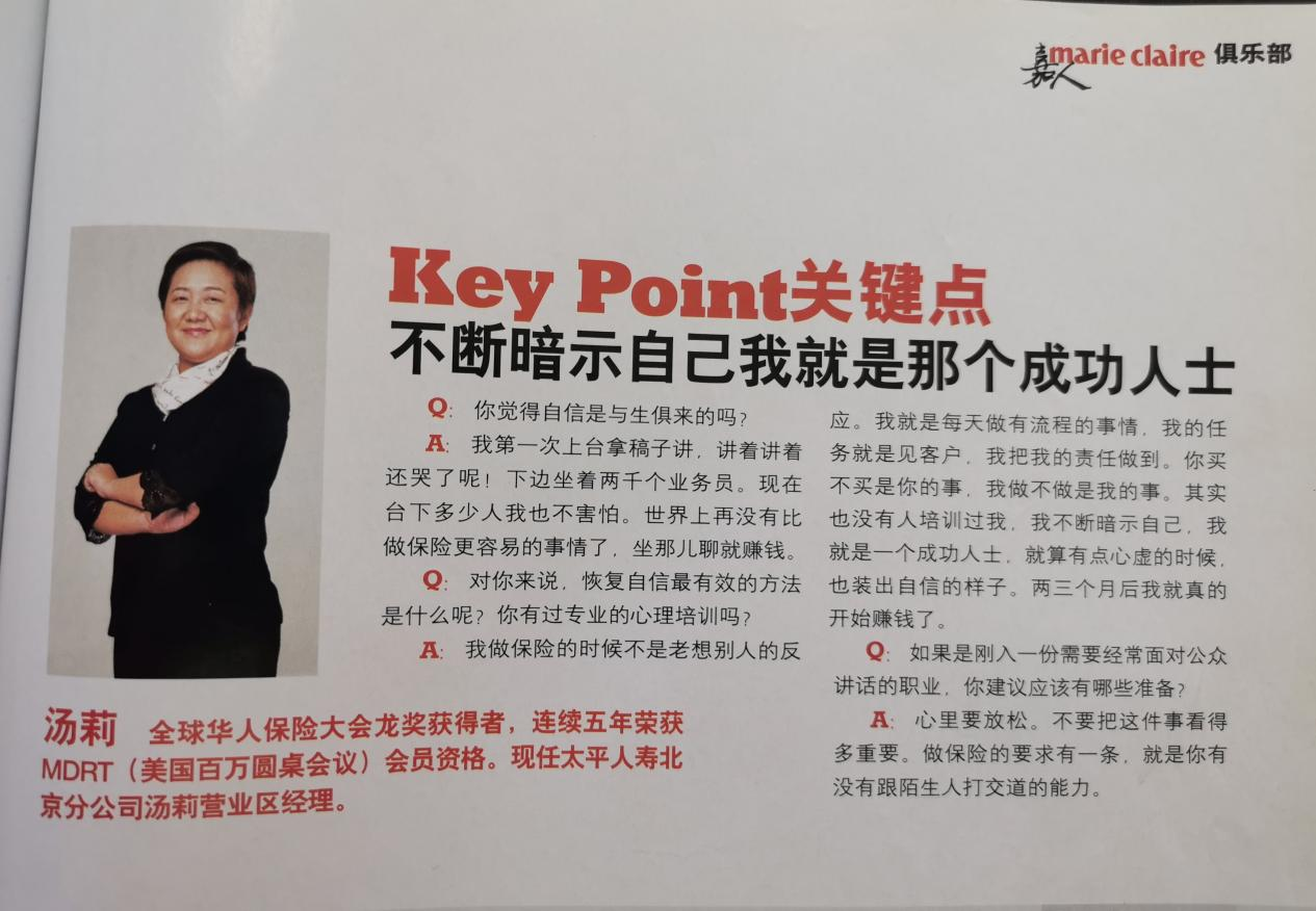 说起网红,虽然这是近几年才兴起的一个新词,但是汤莉自信地说,放到二十年前,她也是妥妥的一个网红了。2000年前后,汤莉大大小小上了十几次杂志报纸,还都不是自己要求的。“那会儿都是公司找人给我做宣传,因为我那段时间成绩做得优秀,是公司的代理人标杆。”说及此,汤莉还会流露出很自豪的表情,但随即又补充道“但知道我的基本上都是业内人士,对我自己的工作并没有什么太大帮助。”的确,那个时候在保险业流传着一句“南蹇宏,北汤莉”,汤莉曾连续几年拿下中国人寿北京分公司销售第一的成绩,也担任过业务总监,曾经也是风光无限的。