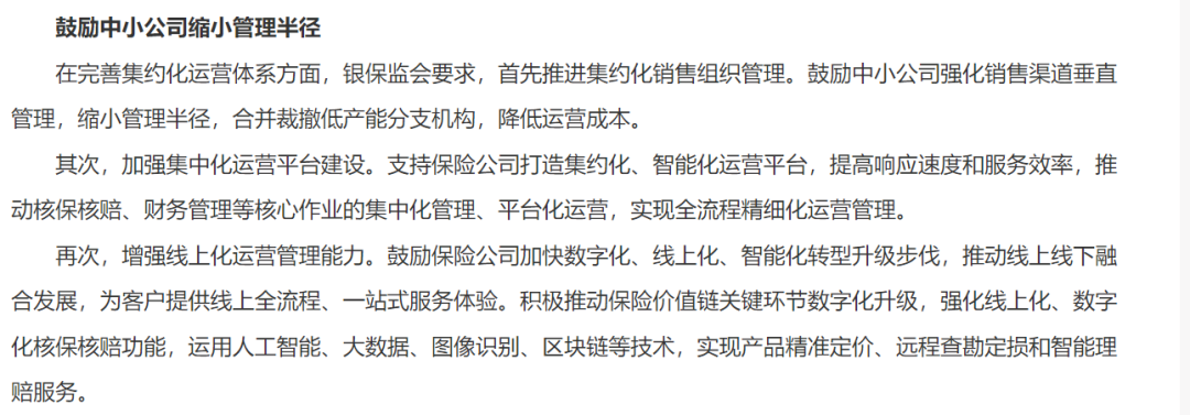 让我们回到国家政策宏观层面,在今年9月,银保监会在业内发布《推动财产保险专业化、精细化、集约化发展的指导意见》,提出要推进集约化销售组织管理。科学划分和有效整合销售渠道,通过渠道细分和销售运作模式改善,降低销售成本、提升经营质效。鼓励中小公司强化销售渠道垂直管理,缩小管理半径,合并裁撤低产能分支机构,降低运营成本。