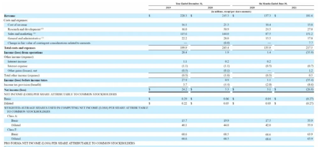 nerdwallet在2019年到2021年的营收分别是2.28亿美元、2.45亿美元、3.79亿美元,净利润分别是2420万美元、530万美元、-4250万美元,其中2021年上半年就亏损了2680万美元。