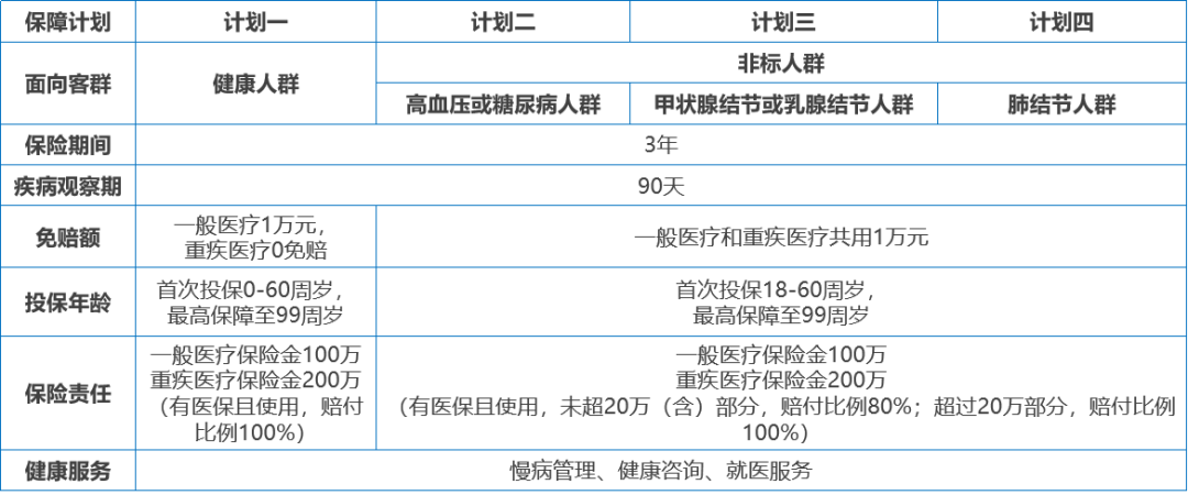 作为太保首款管理式医疗非标体健康险产品,“家安芯”别出心裁设计了四大投保计划来满足非标体客户中细分人群的投保需求,可覆盖原发性高血压、Ⅱ型糖尿病、甲状腺结节、乳腺结节和肺结节5大带病人群。包括TI-RADS 3级及以下的甲状腺结节、BI-RADS 2级及以下的乳腺结节、单个实性且小于等于6毫米的肺结节、原发性高血压(低于160/100 mmHg)和2型糖尿病(糖化血红蛋白小于等于7%或空腹血糖小于等于7.0mmol/L)都有机会承保。