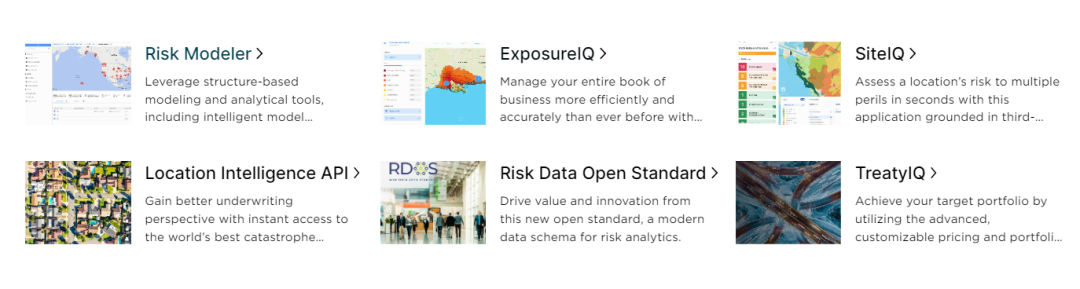 其中RMS的巨灾模型智能平台由六个程序模块组成,分别是风险建模师、曝光智能、站点智能、位置智能API、风险数据开放标准、条约智能。