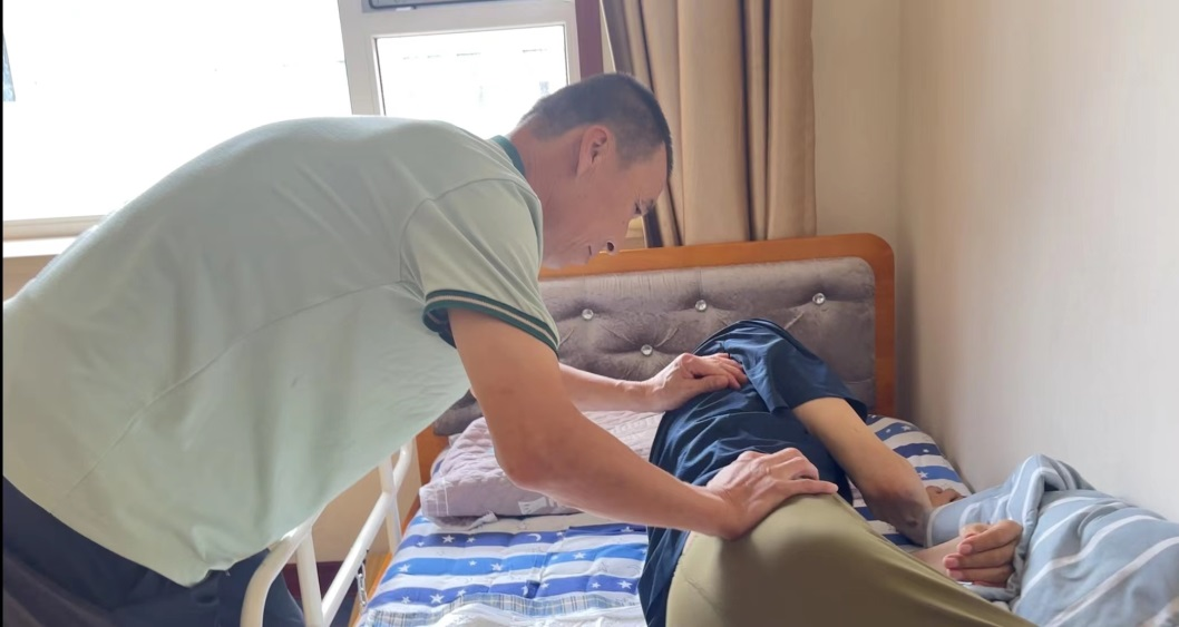 微风从窗外徐徐吹进,长春市高新区馨欣安老院二楼的病床上,护理员杜军正在为72岁的重度失能人员孙家树(化名)做身体按摩。