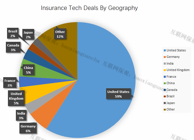 从地区分布上看,大部分融资案例发生在美国,其次是德国,英国等欧洲国家。这和这些国家的保险业发展成熟度,消费者意识,技术手段,政策等因素有关。在美国,一方面医疗险本身就是美国体量最大的险种,奥巴马医改政策对医疗行业产生了巨大的影响,因此这方面诞生了很多的保险创业公司。另一方面,由于移动医疗,物联网,大数据等新技术的成熟和应用,推动了保险行业的创新企业发展。中国的互联网保险融资事件数也占据了全球5%的份额,排名第四。