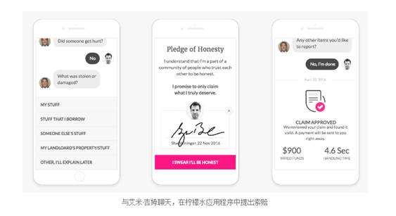 同样的,索赔也由机器人完成。用户需要先电子签名一份“我说真话”的声明,录制一个小视频来陈述受损状况,索赔机器人将根据“声明的性质、严重程度以及用户是否处于紧急状态”的算法,评估欺诈行为的可能性,短短几分钟就能完成理赔。目前,Lemonade上90%的的理赔都能够通过机器人完成。