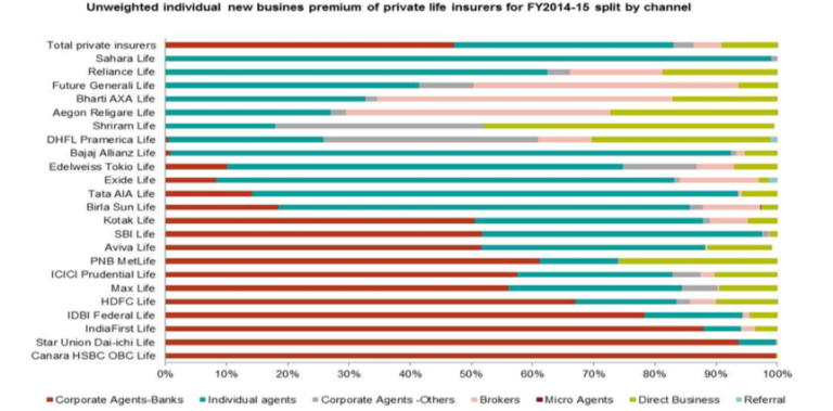 以下2014-15的图表显示了印度寿险和非寿险领域经销渠道的概览。