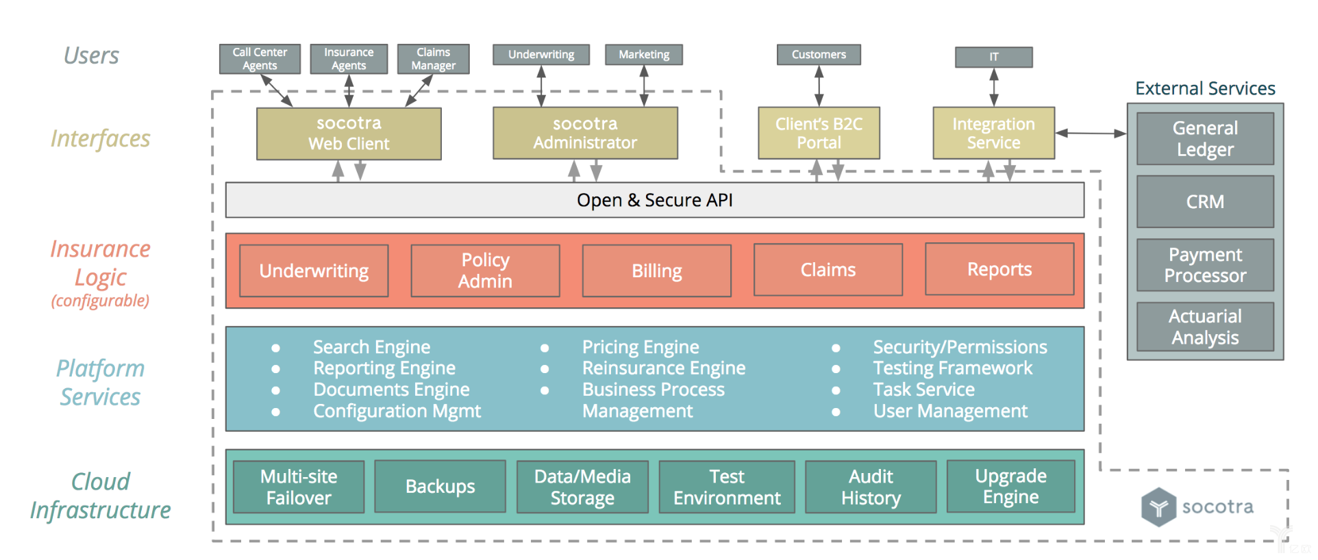 据了解,Socotra的保险云核心平台主要聚焦于PaaS层。提供包括搜索引擎、报告引擎、文件引擎、定价引擎、业务流程管理、安全任务管理等支持保险公司开发应用程序的关键组件。