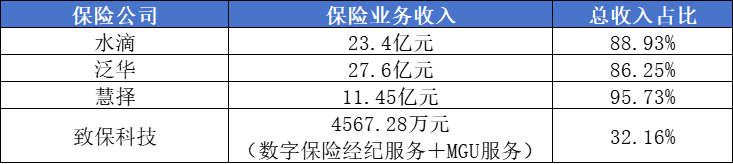 从上图可以发现,水滴和泛华的保险业务总收入占比都超过85%以上,而慧择更是超过了95%,而相比之下,致保科技占比较低。这也说明头部保险中介的营收结构也没能做到多元化,销售仍然占据了营收大头,一旦受到一些冲击,都会给公司的业务业绩带来巨大的影响。