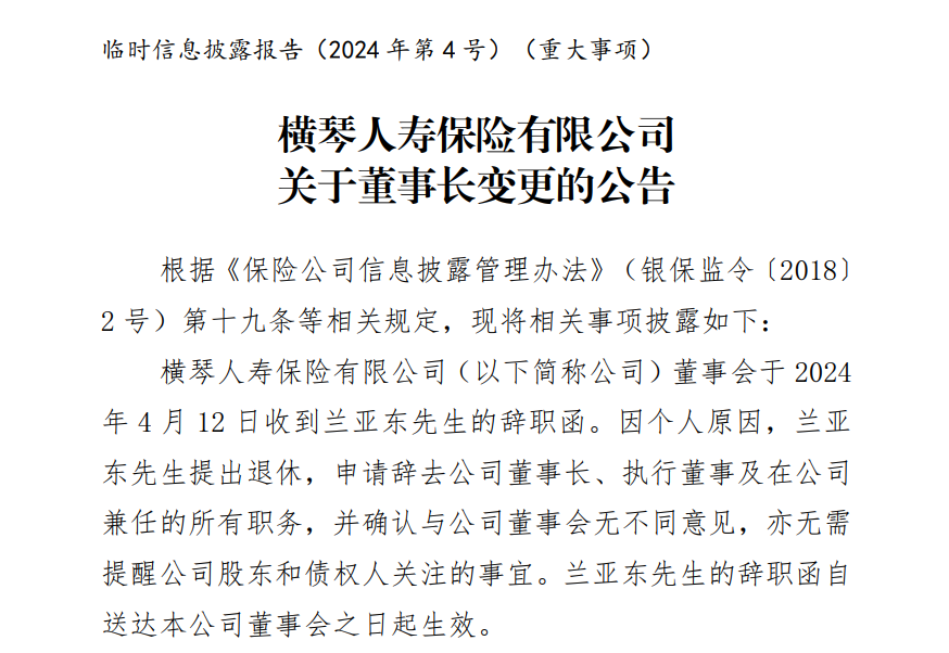 以横琴人寿为例,在4月15日的公告中横琴人寿表示,因个人原因,兰亚东提出退休,申请辞去公司董事长、执行董事及在公司兼任的所有职务,并确认与公司董事会无不同意见,亦无需提醒公司股东和债权人关注的事宜。后选举钱仲华为执行董事及董事长,待其董事长任职资格核准后正式履职。