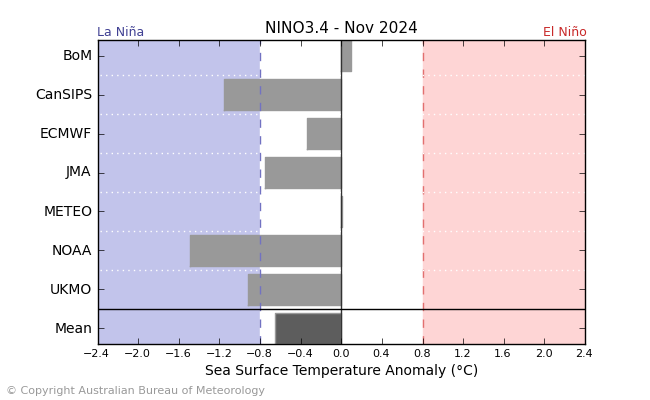 下图:7家机构预测到2024年10月的Niño3.4指数,其中Mean是7家机构预测的集合平均值;
