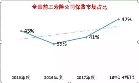 从下图数据可知,保险市场也呈现分化集中的趋势,先说集中:前三寿险公司的集中度从16年的39%,到17年的41%,到目前的47%,集中度得到提升。