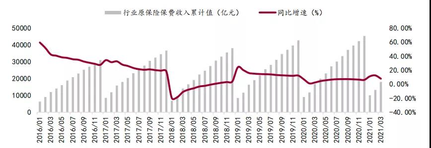 从银保监会公布的行业保费数据来看,截至2021年3月末,保险业1-3月保费收入17995.17亿元,同比增长16.7%,增速较上月有所下滑;3月单月保费收入4765.29亿元,同比-3.3%,自去年3月以来首月保费同比负增长,负债端增长乏力。
