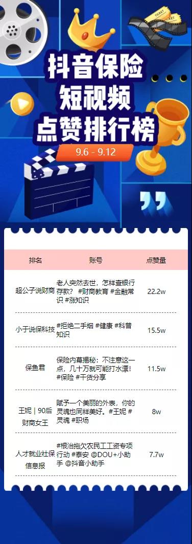本期依靠“保观数据”得出的保险类短视频账号相关情况仍以榜单的形式呈现,我们排出了目前抖音和快手平台9月6日-9月12日保险类短视频号粉丝量前15名、涨粉量前15名的保险类短视频账号,以及点赞量最多的保险类短视频内容。