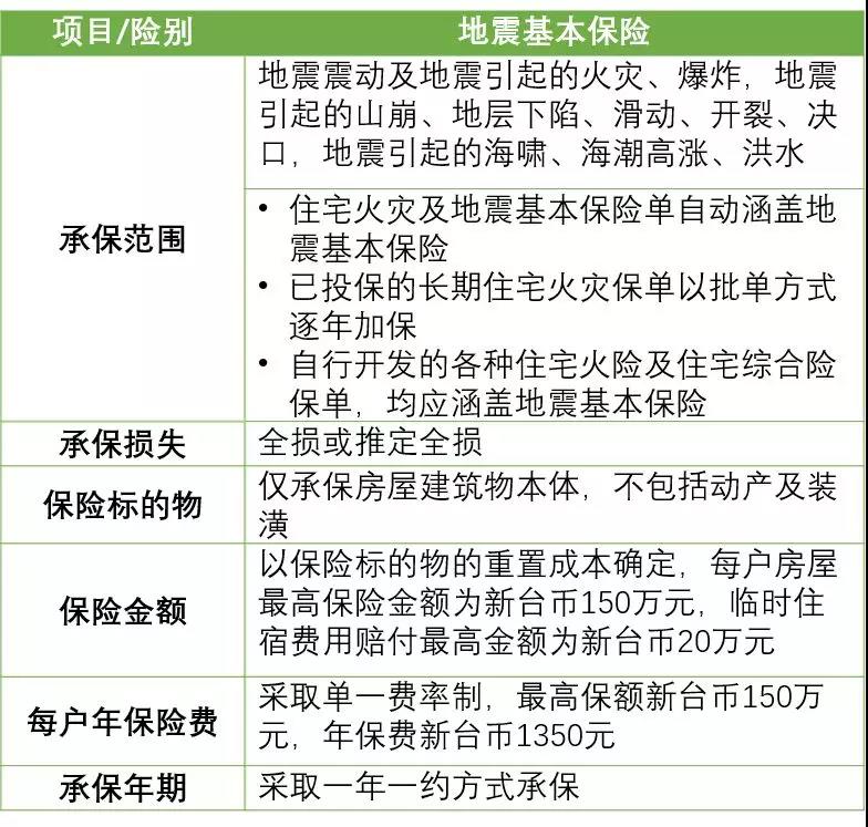 在921地震发生后,1999年“产险公会”和“中央再保”共同组成“住宅地震保险共保执行小组”。2001年依据《住宅地震保险共保及危险承担机制实施办法》,由“产险公会”和“中央再保”共同组成住宅地震保险共保组织。2001年11月,主管机关颁布,规定住宅地震保险的运作方式为各财产保险公司将承保的住宅地震保险全数分保到当时的政府下属专业再保险公司——中央再保险公司,该公司接收后再分保至台湾地区保险公司、地震保险基金、国际再保险市场等进行分层承担,总危险承担限额为新台币500亿元。其后,对保额、保费、风险分担机制等又进行了多次调整。截至2017年底,住宅地震基本保险的投保率为33.12%,有效保单件数大281万件,累积准备金新台币246.32亿元。