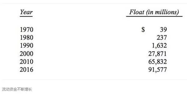 我们被财险业务吸引的原因之一是其金融特征:财险公司提前收到保险费,之后再支付理赔金。在极端情况下,例如理赔产生于接触石棉,款项支付可以延续好几十年。这种现在收以后付的模式使得财险公司持有大量流动资金。与此同时,保险公司能够出于自己的利益进行投资。虽然个人保单和索赔变化不定,但是保险公司持有的流动资金往往较保险费保持相对稳定。其结果是,随着企业发展,流动资金也增长。至于如何发展,如下图所示: