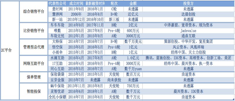 在2c平台中,分为六大部分,有综合销售平台、比价销售平台、管理型总代理、网络互助平台、保单管理、智能投保。其中,综合销售平台中,意时网、慧择网、新一站是代表性公司;在比价销售平台中,车车车险、唯数、车险无忧是代表性公司;在管理型总代理平台中,大特保、悟空保、小雨伞是代表性公司;在网络互助平台中,水滴互助、同心互助、17互助是代表性公司;在保单管理平台中,保险袋袋、豆芽金服是代表性公司;在智能投保中,蜗牛保险、全牛小保镖是代表性公司。