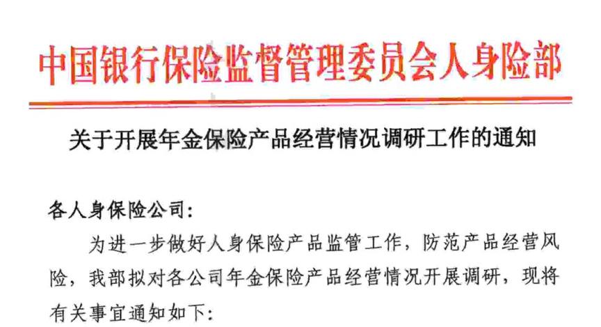 为了进一步做好人身保险产品监管工作,防范产品经营风险,中国银保监会近日对各人身保险公司下发了《关于开展年金保险产品经营情况调研工作的通知》(下称《通知》)。