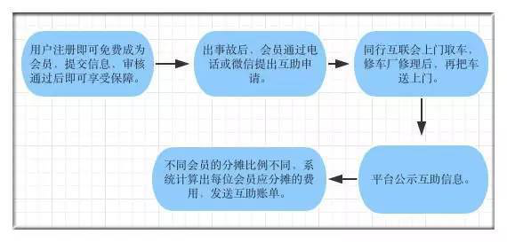 以车损互助计划为例,用户注册即可免费成为会员,提交信息,审核通过后即可享受保障。车辆出事故的会员可以通过电话或微信联系同行互联,后者会上门取车、修理,再把车送上门。维修信息会在平台上公示,再由会员分摊费用。修车期间,同行互联还每天为用户提供50元的滴滴打车券。