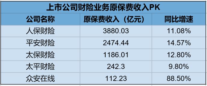 对于大型上市集团来说,旗下财险公司的表现对集团整体贡献也很重要。2018年全年,包括人保财险、平安财险、太保财险、太平财险和众安在线五家上市公司,在财险业务方面都交出了漂亮的成绩单,原保费收入增速大多都维持在两位数以上。