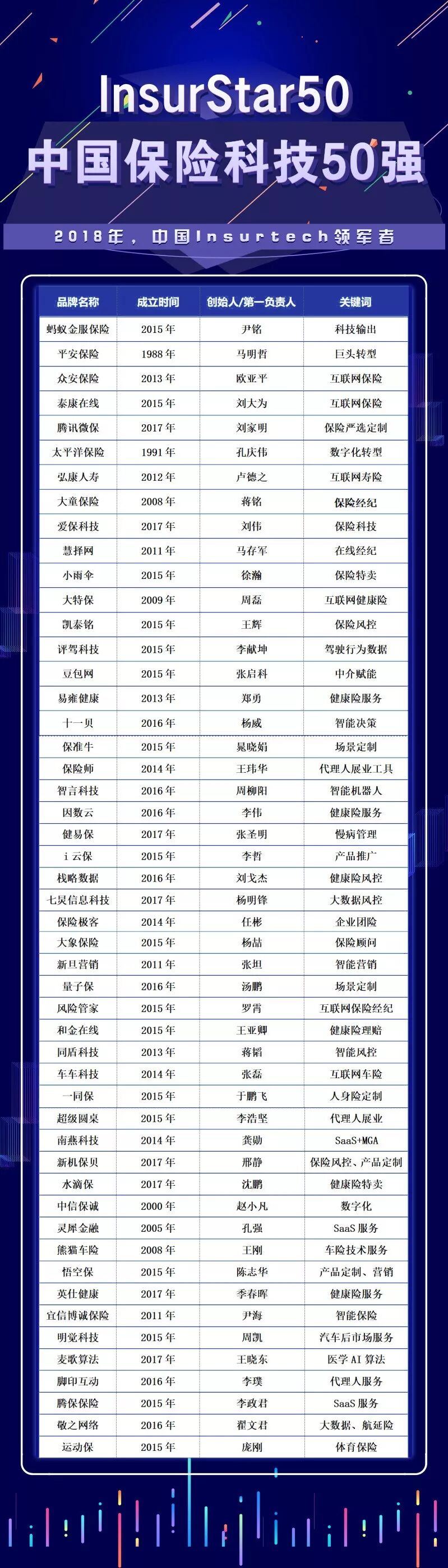 保观经过近两年的市场观察,综合商业模式创新、技术创新、品牌影响力、营收/用户/业务规模、融资/估值金额等因素,评选出了50家保险科技创新企业代表,包括保险公司、中介机构、互联网公司、第三方创业公司等主体。