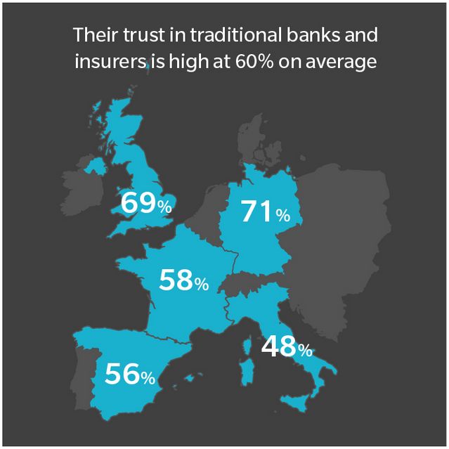 调查结果显示,欧洲大部分的金融客户,对于传统银行和保险公司依然有着较高的信赖度,平均信赖度为60%。其中,德国人对传统金融机构的信任度最高,达到了71%,其次分别是英国(60%)、法国(58%)、西班牙(56%)和意大利(48%)
