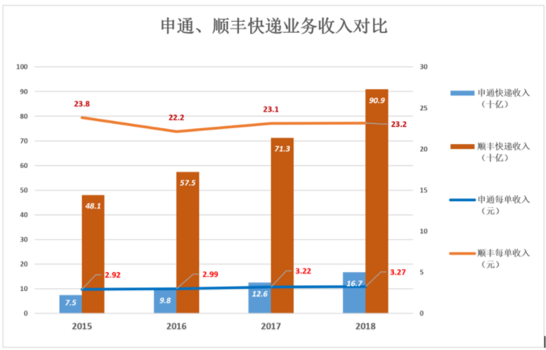 据报道,阿里投资申通之前,申通中国快递市场的份额从2014年的16.8%降至2015年的12.4%,2016年进一步降至10.4%。2017年、2018年的份额分别为9.7%和10.1%。而2018年业务量,业内排名仅仅为第五名。营收方面也并不乐观,以顺丰为参照,2018年申通、顺丰业务量分别为51.1亿和38.7亿,申通领先32%。但申通167亿快递收入仅相当于顺丰的18.4%。