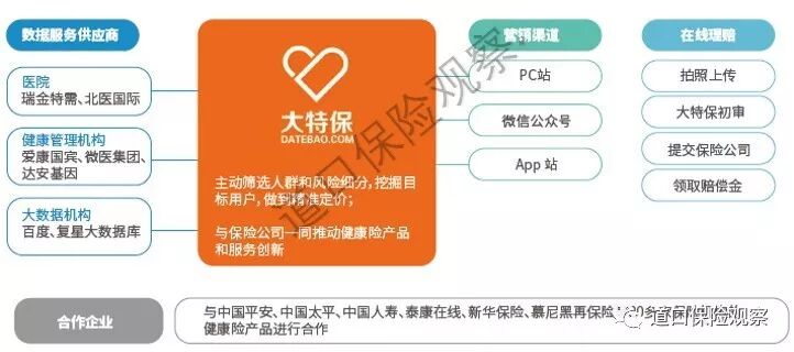 大特保整合了保险公司、医疗机构、健康管理机构、大数据机构等多方面的资源,为用户提供多层次的保险产品,同时大特保还拥有自己的营销渠道和在线理赔服务体系。