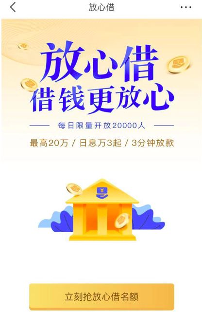 这便是“放心借”的入口。点击,进入“放心借”产品页面,显示“每日限量开放20000人”。