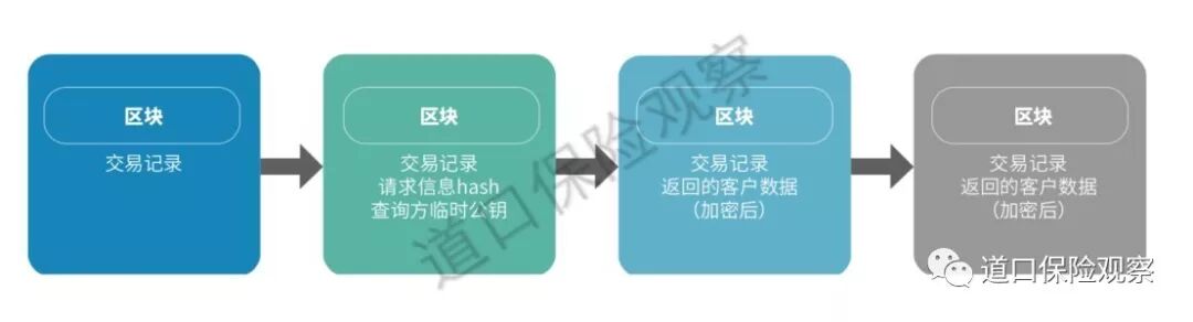 上海保交所借助区块链技术分布式、信息加密等特性可以实现保险行业的匿名数据交易,保险公司不仅在核保时可以通过查询风险累计降低承保风险,同时也可以作为数据提供方享受数据变现,且无须担心客户信息泄露。首先A保险公司发送查询请求到各个保险公司,联盟内的保险公司获得请求后,查询本地数据库,并在链上返回查询结果。上海保交所会把这一操作过程记录在链上(具体如图4)。通过这平台能有效地整合行业内数据信息,为保险行业提供征信服务。
