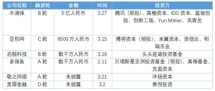 3月27日,水滴保母公司宣布完成5亿元B轮融资,在2019年第一季度的互联网保险融资表中排名首位,也是自2018年资本寒冬以来互联网健康险与健康保障领域额度最大的一笔融资。巨额融资的背后是资本对水滴保的认可,也释放出一个极为明显的信号:行业头部玩家竞争格局已定,流量型平台即将成为主流。