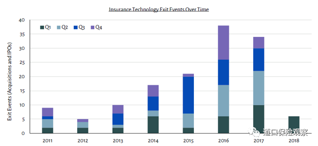 保险科技公司退出(IPO或并购)事件近年增长强劲,在2012-2017年以47%的复合年增长率增长。2018年第一季度退出公司数量为2017年第一季度的60%。