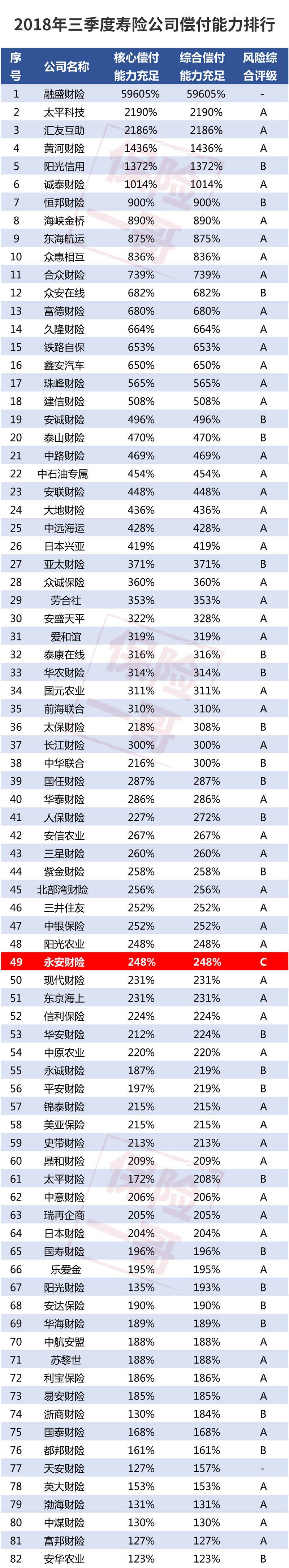 2018年三季度偿付能力数据出炉,“问题公司”仍是老面孔。其中:新光海航增资成功核心/综合偿付能力充足率达标;永安财险连续两个季度风险综合评级为C;吉祥人寿综合偿付能力仍不达标;中法人寿未见任何起色。
