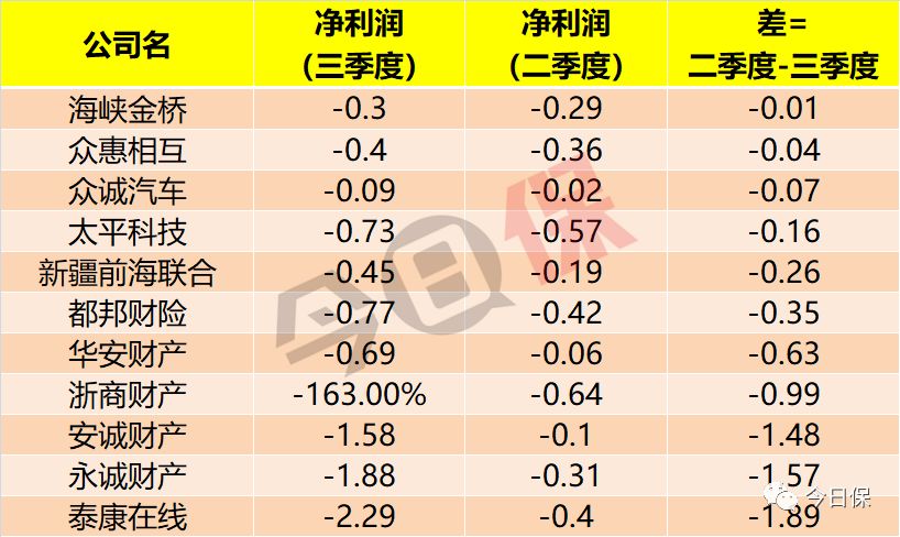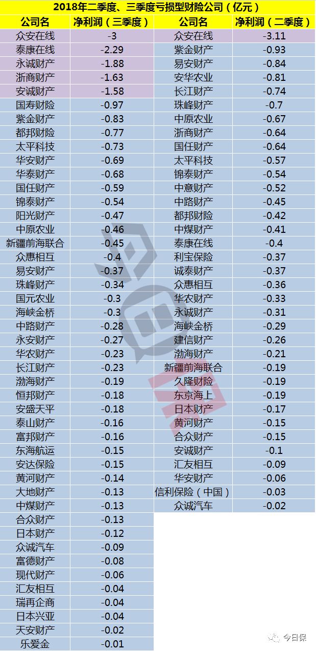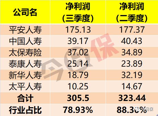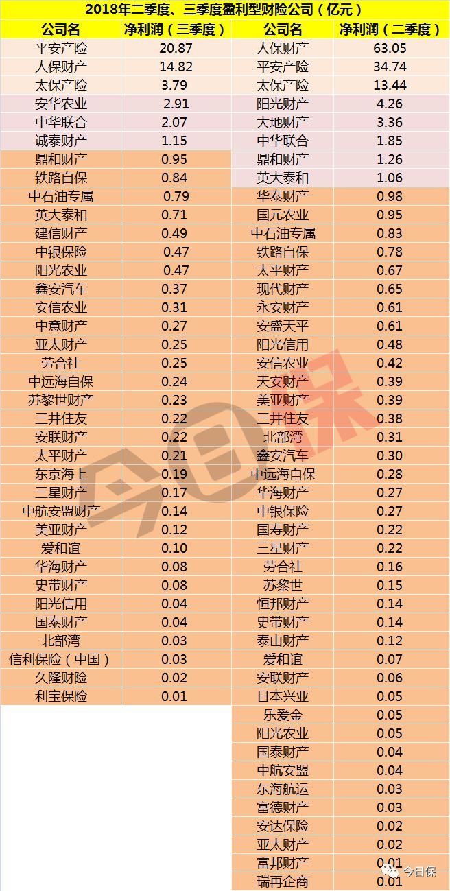 寿险篇:老六家净利下滑,40家公司环比负增长 1 老六家净利润行业占比下滑近10个百分点 相对于上半年占比行业净利润版图九成的业绩,国寿、平安人寿、太保寿险、新华保险、泰康人寿及太平人寿“老六家”第三季度的净利润之和占比下滑近10个百分点。 纵然依赖个别寿险公司前两年之投资释放后的收益猛增,实现了85家寿险公司合计净利润环比增长近6个百分点的业绩,但传统巨头之业绩已经宣告了未来之路。 2 37家寿险公司三季度亏损 与第二季度相同,三季度的寿险公司亏损者依旧是37家,且亏损程度大幅收窄。 第二季度,37家寿险公司共计亏损48.5亿元,第三季度这一数字收窄为22.5亿元。 事实上,一二季度亏损符合中国保险公司,尤其是寿险公司经营规律。上半年的开门红期间,正是寿险公司投入最多、业务价值最差的阶段,整体经营业绩的好转有赖于三四季度的业务结构调整和投资收益的释放。 这一点在上述的二三季度的利润表中可以看出,二季度前十大亏损公司共计亏40.2亿元,三季度收窄为16亿元。 其中单季亏损超过5亿元的寿险公司二季度有4家,三季度无。一二季度合计亏损超过10亿元的前海人寿,三季度一举盈利超过30亿元,直接拉升了寿险公司整个三季度的业绩。也在一定程度上遮蔽了三季度的不乐观之情况。 这一年,转让万科A,出清中炬高新的前海人寿投资收益颇丰。 3 真正的问题在于传统强者盈利收窄 仅从上述图表看,这一点似乎并不明显。 三季度盈利过亿的寿险公司24家,仅比二季度少一家;利润总和亦相差不大,三季度数字为406.6亿元,二季度为410亿元。 如果剔除前海人寿超过30亿元的净利润,上述盈利过亿元的寿险公司净利润之和出现七八个百分点的下滑。 “老六家”的合计净利润环比少收近20亿元的事实,已经证明了寿险公司盈利的收窄。另外,净利润过10亿者二季度约9家,三季度8家。 这一点在持续盈利公司中表现明显。下图中21家持续盈利的寿险公司在二、三季度均未亏损,但相当部分企业收窄明显。 财险篇:不确定中强化的马太效应,净利不足寿险一成 1 财险老三家净利超财险行业120% 31.47亿元,三季度财险合计净利润,仅占寿险净利润的8.15%,环比下降-73.33%;二季度,财险行业净利润111.23亿元。 125.45%,财险“老三家”人保财险、平安产险、太保产险三季度的净利润之和所占的市场份额。相比上半年净利润接近100%的份额,再度提升了20多个百分点。 同寿险市场一般,传统巨头财险公司净利润在第三季度纷纷下滑严峻。业绩表现最好的平安产险反超财险老大人保财险后,净利润依旧环比下滑-39.93%。人保财险和太保财险三季度净利润环比下滑均超过70%。 如此严峻的数据中,可知财险市场之境况。 2 45家财险公司陷入亏损,环比二季度多了10家 相比二季度35家财险公司的亏损业绩,三季度45家财险公司亏损的成绩再度说明了财险市场之不易。 “老三家”之后财险第二梯队的国寿财险、大地财险、阳光财险等传统中大型财险公司均在列,而华泰财险等多年优质生也在三季度陷入亏损。 财险问题行业皆知,依赖车险的情况下,一荣俱荣、一损俱损。而车险市场除价格竞争外,尚未看到其他有力竞争手段。车险费改尚未到底的征途中,未来已注定。 这一点新小财险公司表现突出,其中的代表是几家互联网财险公司。除了没有披露偿付能力报告的安心财险,易安、众安、泰康在线皆亏损。 3 盈利者多特色险企 这部分不用多做解释,以农险为主、巨头实业公司的自保公司、或特殊资源者多有经营不错者。如以地方政府为背景的财险公司和电力系财险公司。 期间原因,不可复制的资源禀赋。 注释:本次统计寿险公司不包括国寿续存、国富人寿、和谐健康、国寿养老、长江养老、安邦人寿、安邦养老、新华养老、人保养老;财险公司不包括出口信用、安邦、长安责任、燕赵财产、安心、粤电自保。