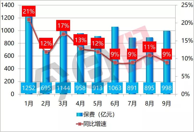 其中,9月单月财险实现保费收入998亿元,同比增长9%。相比前5个月平均15%的保费增速,进入下半年以来的财险业增长乏力。事实上,5月份后,财险行业保费单月增速未能跑赢行业12.5%的平均增速。